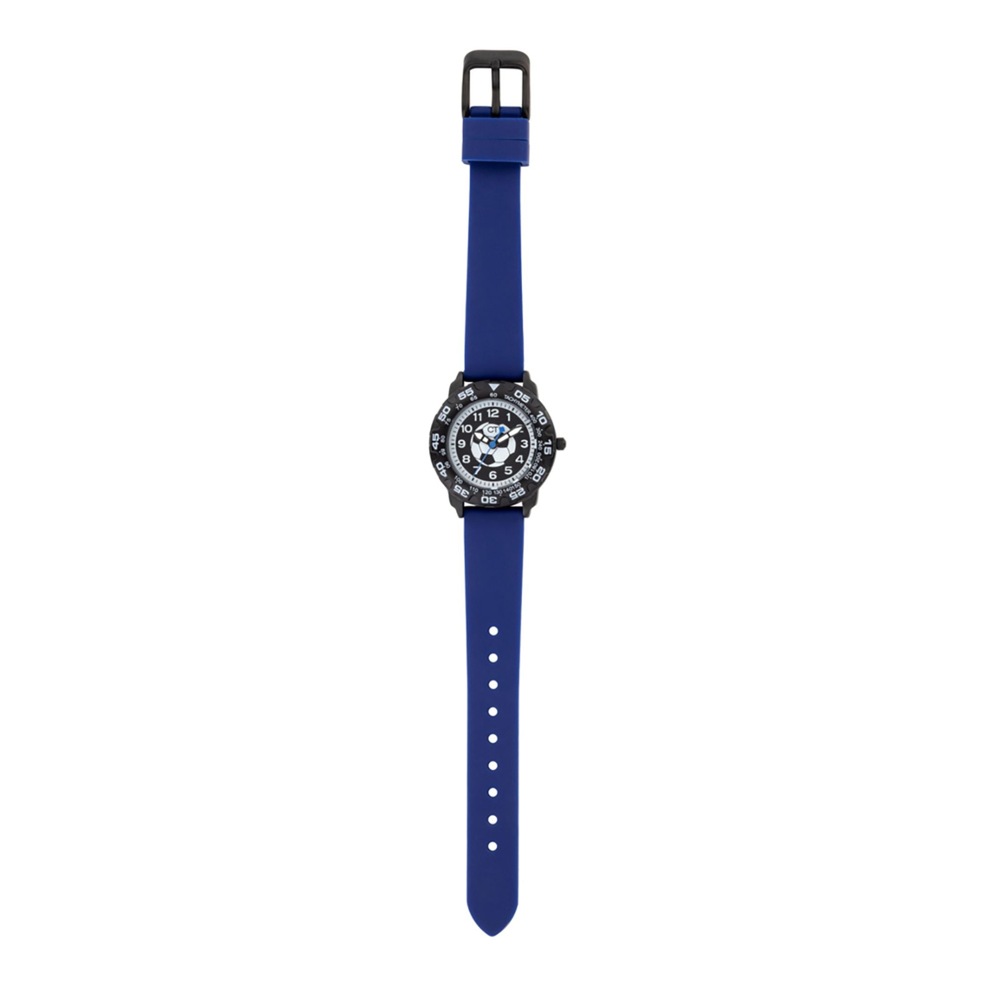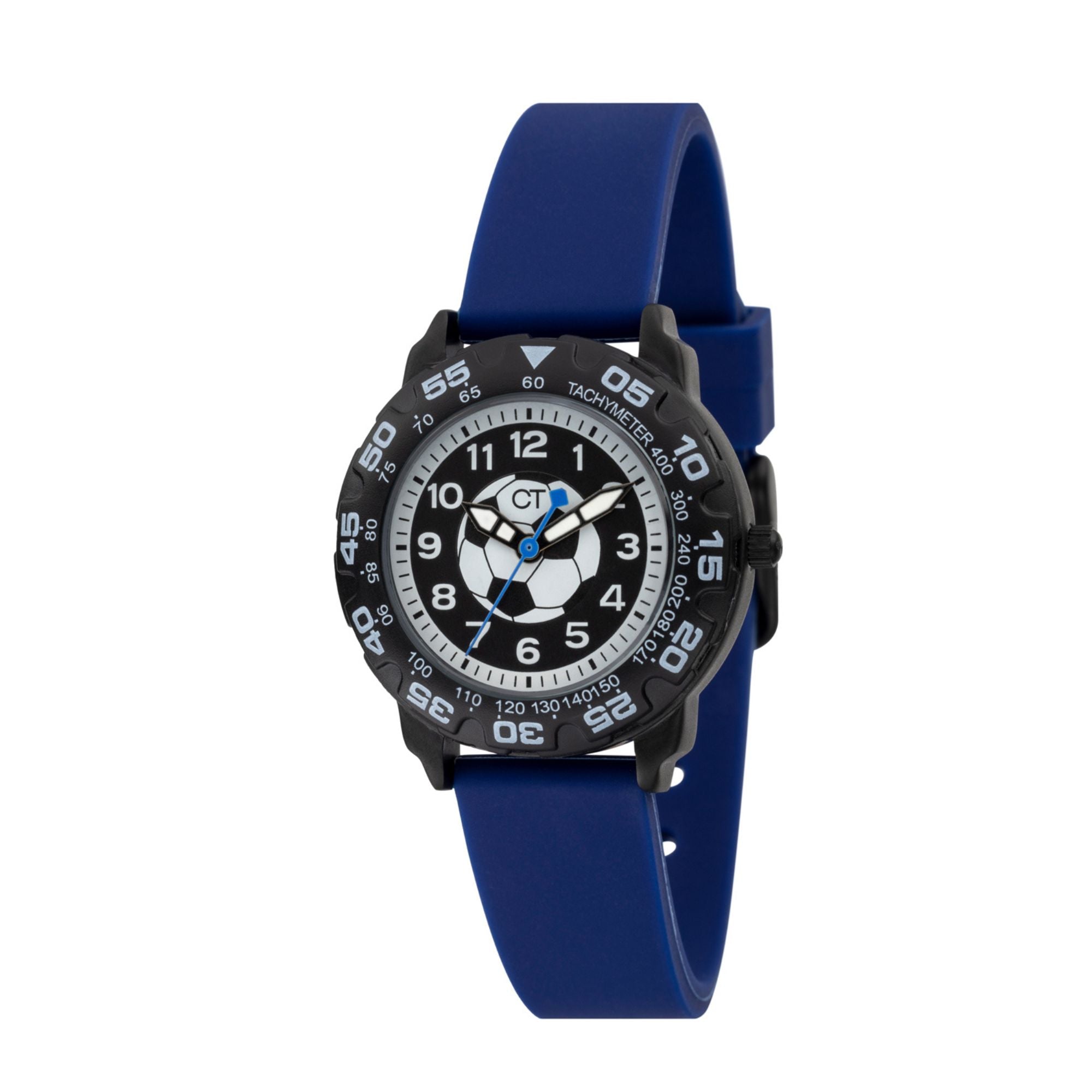 "Fußball-Fans aufgepasst! Ob groß oder klein, diese sportlich-coole Kinderuhr mit schwarz-beschichtetem Gehäuse und drehbarem Topring der Marke Cool Time lässt die Herzen aller Fußball-Fans höher schlagen. Neben dem Design wurde bei der Entwicklung auch auf die Qualität besonders viel Wert gelegt. So ist die Kinderuhr mit Sillikonarmband schadstoffgeprüft, widerstandsfähig, abwaschbar und sehr komfortabel zu tragen. Dank klarer Zahlen und präzisen Minuteneinteilungen wird das Erlernen der Uhrzeit zum Kinderspiel. Ein zuverlässiges Quarzwerk und kratzunempfindliches Mineralglas runden die Kinderuhr optimal ab. Verpackt im coolen Mäppchen mit Eulen-Motiv ist die Uhr ein ideales Geschenk und sorgt auch in der Schule für ""Cool Time"".