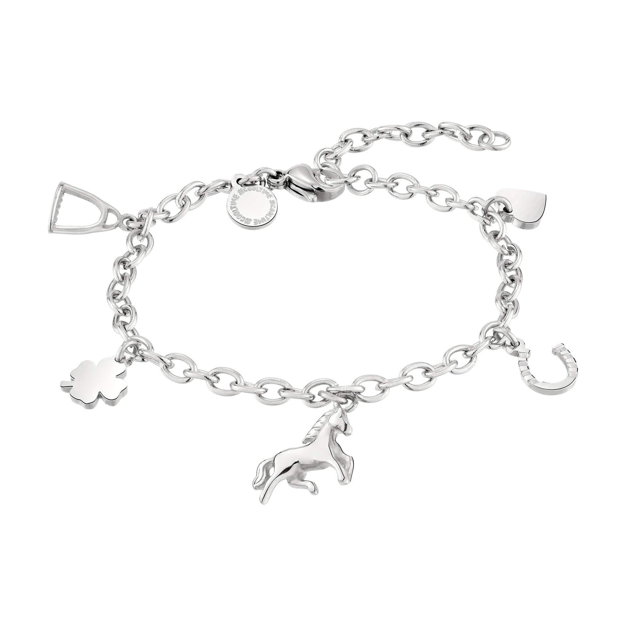 Das Charms Armband von Cool Time ist ein wahrer Stimmungsmacher. Die Pferd, Hufeisen, Kleeblatt, Herz und Steigbügel Charms machen gute Laune und sind gleichzeitig ein wirklich cooles Fashion Accessoire. Toll kombinierbar zu anderen Schmuckstücken oder Uhren aus der Kollektion.