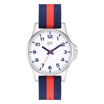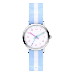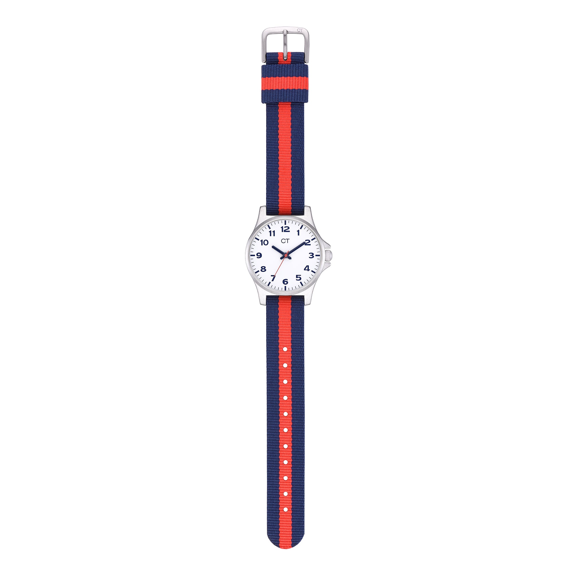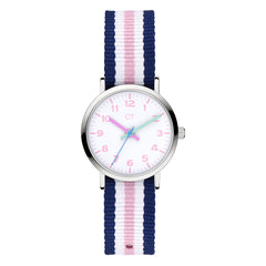 Diese schöne Kinderuhr der Marke Cool Time lässt Kinder-Herzen höher schlagen. Neben dem mit viel Liebe zum Detail entworfenen Streifen-Design wurde bei der Entwicklung auch auf die Qualität besonders viel Wert gelegt. So ist die Kinderuhr mit Textilband schadstoffgeprüft, widerstandsfähig und sehr komfortabel zu tragen. Dank klarer Zahlen und präzisen Minuteneinteilungen wird das Erlernen der Uhrzeit zum Kinderspiel. Ein zuverlässiges Quarzwerk und kratzunempfindliches Mineralglas runden die Kinderuhr optimal ab. Verpackt im coolen Mäppchen ist die Uhr ein ideales Geschenk und sorgt auch in der Schule für "Cool Time".